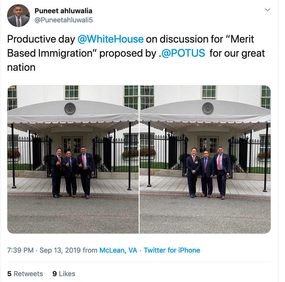 Later on Friday, Ahluwalia tweeted a photo of himself apparently exiting the White House, saying he was there to discuss U.S. immigration policy.