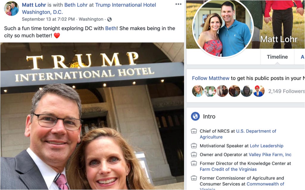 Matt Lohr, the Department of Agriculture Natural Resources Conservation Service chief and a political appointee, promoted the president’s hotel on Facebook and Instagram.