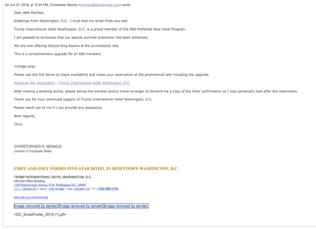 As of last June, Trump’s D.C. hotel offered ABA members a similar deal, with the hotel’s director of corporate sales even alerting some ABA members to its offer via email. The D.C. property, however, appears to no longer be participating in the ABA’s member-discount program.