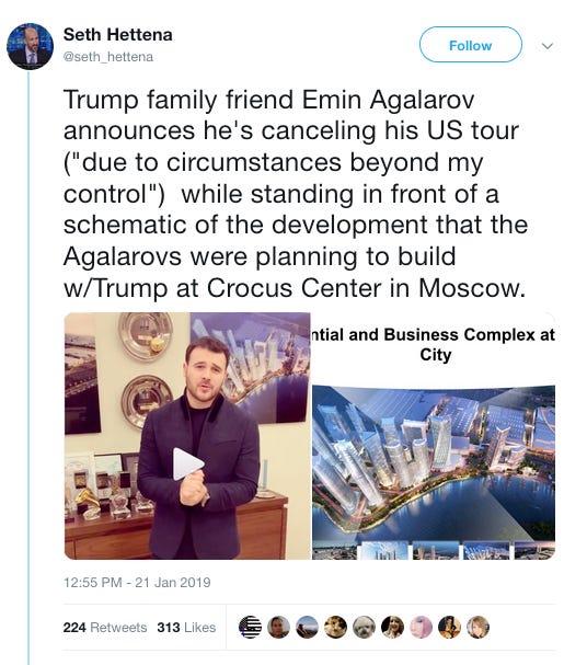 Russian singer Emin Agalarov, who reportedly arranged Trump Org EVP Donald Trump Jr.’s 2016 Trump Tower meeting with a Kremlin-linked Russian lawyer, canceled his U.S. tour. He made the announcement in front of a backdrop showing a planned Trump development in Moscow. Via Seth Hettena on Twitter.