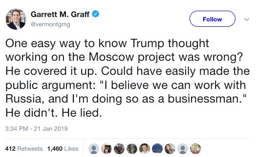 Wired’s Garrett Graff had an interesting take on Trump’s Moscow project: