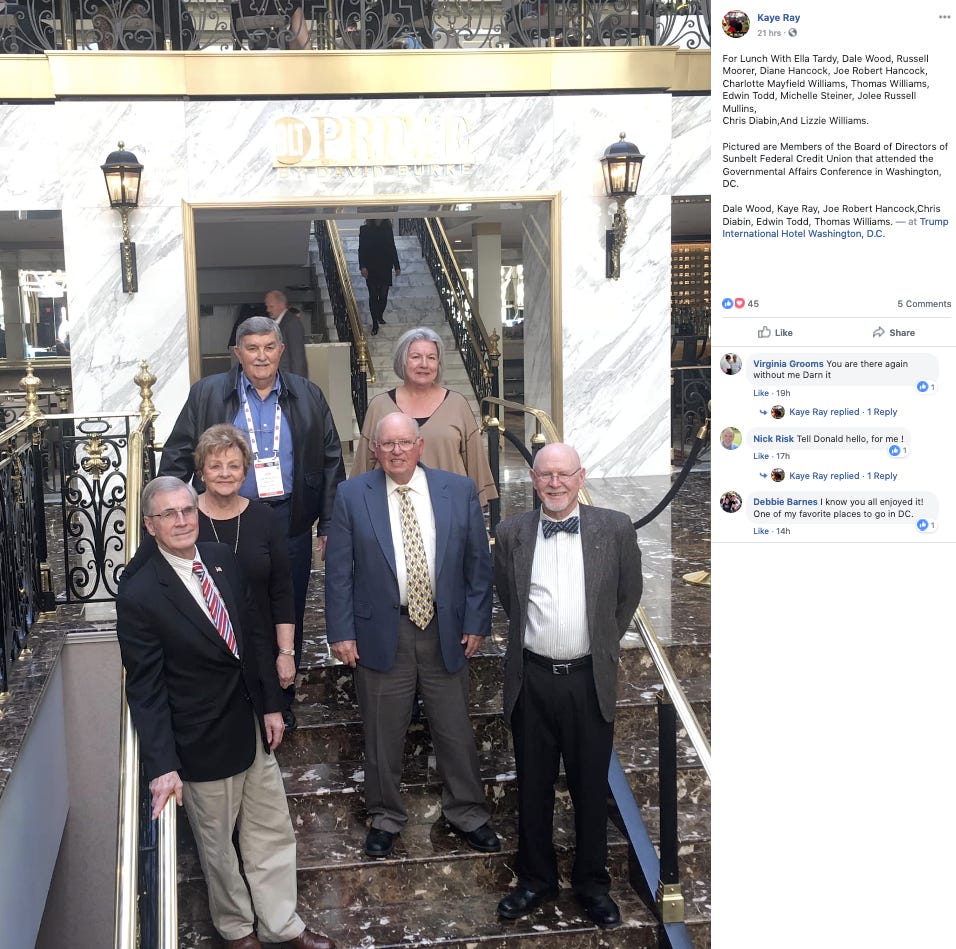 In town for the Credit Union National Association’s governmental affairs conference, “members of the board of directors of Sunbelt Federal Credit Union” went to the Trump Hotel D.C.