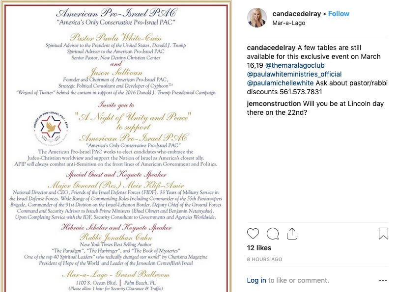 As for this weekend’s fundraiser, an inquiry to APIP asking how much it’s spending and why it decided to return to Mar-a-Lago was not answered. While access to details about the event on APIP’s website require a password, according to an invite posted on Instagram, Paula White-Cain and Jason Sullivan are the hosts. White-Cain is Trump’s personal pastor, delivered the invocation at his inauguration, and preaches the prosperity gospel. In May 2018, Robert Mueller subpoenaed Sullivan related to his work for Roger Stone.