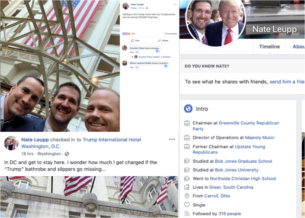 Rep. William Timmons (R–SC) chilled with the chair of the Greenville County [S.C.] Republican Party, Nate Leupp, and the former chair of the South Carolina GOP. Leupp stayed at the head of his party’s hotel too.