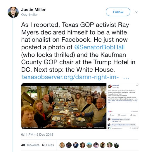 Texas Observer reporter Justin Miller found a photo of Texas GOP activist/declared white nationalist Ray Myers, Texas state Sen. Bob Hall (R), and the Kaufman county GOP chair dining together before heading out for the White House Christmas tour. For more context, read Miller’s “Texas GOP Chair: Racism and Bigotry are an ‘Extreme Exception’ in the Party.”