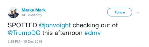Shortly before Jon Voight appeared at the White House, D.C. celebrity spotter Marky Mark (not to be confused with actual celebrity Marky Mark) witnessed the actor checking out of the president’s hotel. And as the Washington Post’s David Fahrenthold pointed out, Voigt will be the guest of honor for the “Trumpettes USA” bash at Trump’s Mar-a-Lago club in February.