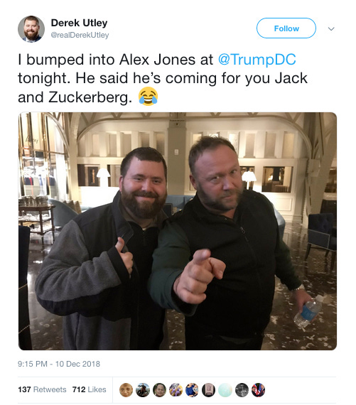 Deplatformed Alex Jones popped up on Twitter from the Trump Hotel D.C.’s lobby (apparently with a bottle of Trump water in his hand, which ostensibly does not turn frogs gay). He’s posing with Derek Utley, the chairman of X Strategies, LLC an “advisor to political figures, media personalities and various organizations.”
