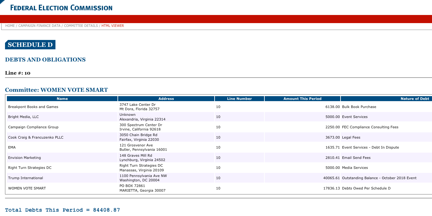 The treasurer for Women Vote Smart, prominent Tea Party activist and early Trump supporter Amy Kremer, has not yet responded to a message sent through her website asking why its bill is unpaid and what her plans are for paying it off (and an email sent to the address on her website bounced back). Last month though Kremer told MSNBC, “Now, you’ve got witches that are placing a hex on [Supreme Court Justice] Brett Kavanaugh.” So don’t rule out the occult here too.