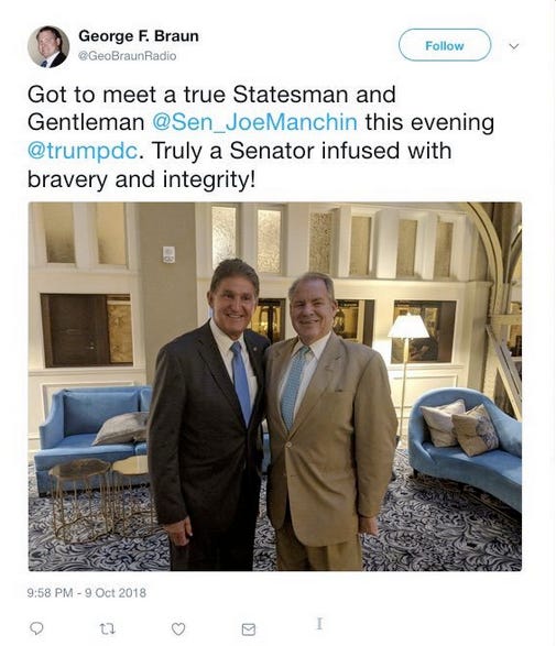 Sen. Joe Manchin (D–WV) who’s been spotted there twice—including just a few days after he was the sole Democrat to vote for Brett Kavanaugh’s nomination to the Supreme Court
