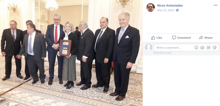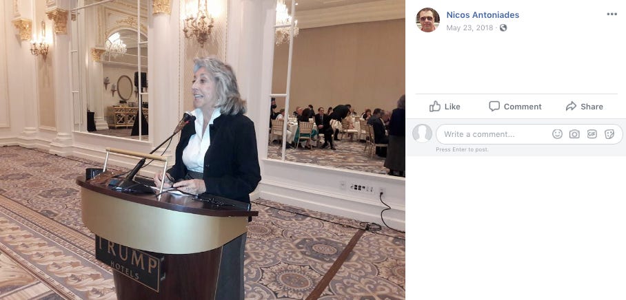 The 34th annual International Coordinating Committee’s “Justice For Cyprus (PSEKA) Conference” was in D.C., at the Trump Hotel, looking “into ways of exerting influence on U.S. President Donald Trump with a view to avert the Islamization of the Turkish occupied part of Cyprus,” per the semi-government-funded but editorial independent Cyprus News Agency. It also reported that two mayors of occupied Cypriot towns and a Greek member of parliament attended the conference, although it’s not clear if they were present for Titus’s remarks.