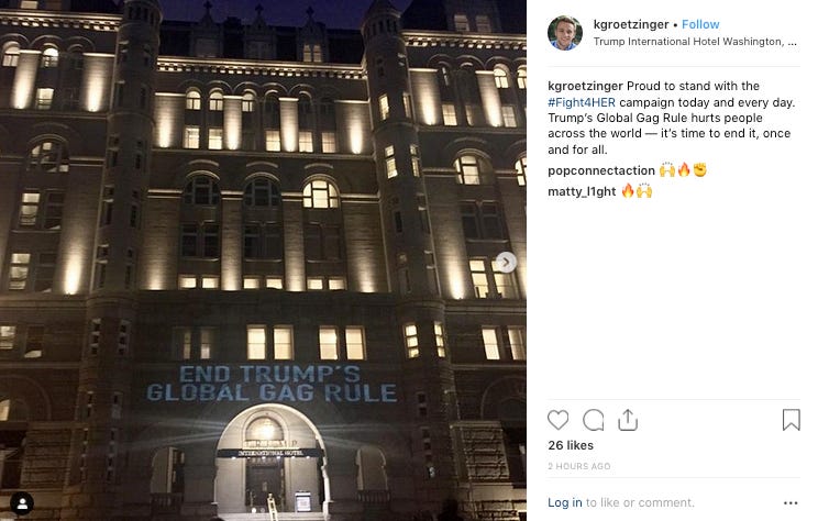 The Fight4Her campaign protested Trump’s earlier reinstatement of the global gag rule, which prevents nongovernmental organizations that receive U.S. government funding from providing or discussing abortions, with a Robin Bell-led visual protest on the hotel’s Pennsylvania Avenue frontage.