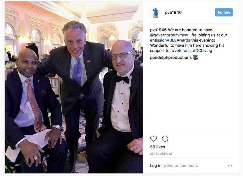then-Virginia Gov. Terry McAuliffe, who was attending a benefit for veterans with disabilities