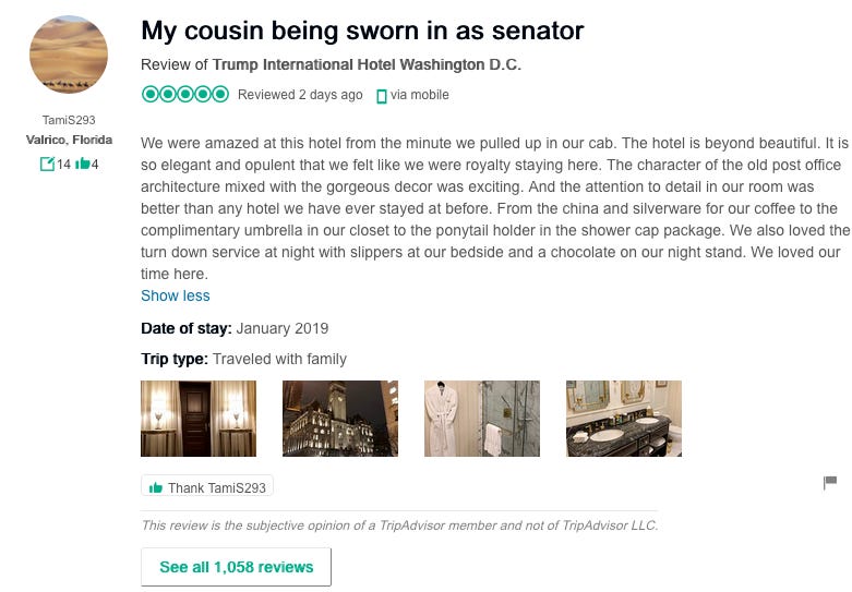 Reportedly in town to watch her cousin sworn in as a U.S. Senator, this Trip Advisor reviewer loved her stay at the president’s hotel.