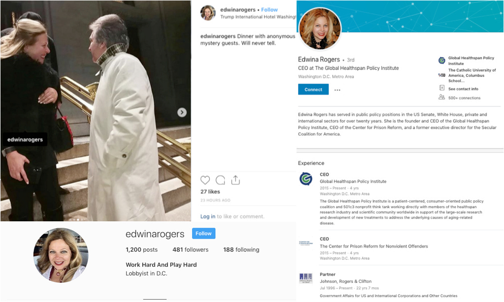 A lobbyist for “U.S. and international corporations and other countries,” Edwina Rogers had dinner with “anonymous mystery guests” at the president’s hotel.