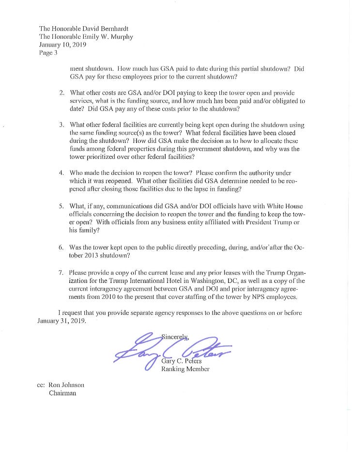 On Thursday, Sen. Gary Peters (D–MI) sent a letter to the Department of the Interior and the General Services Administration seeking details about the decision to re-open the Old Post Office tower despite the government shutdown. The tower, of course, is in the same building as the president’s D.C. hotel.