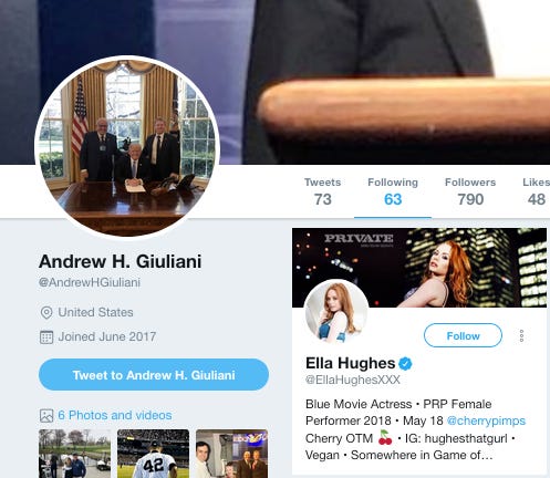 The son of Rudy Giuliani, Andrew Giuliani works in the White House as the public liaison to President Trump. The most recent account Andrew followed on Twitter: award-winning adult actress, Ella Hughes.