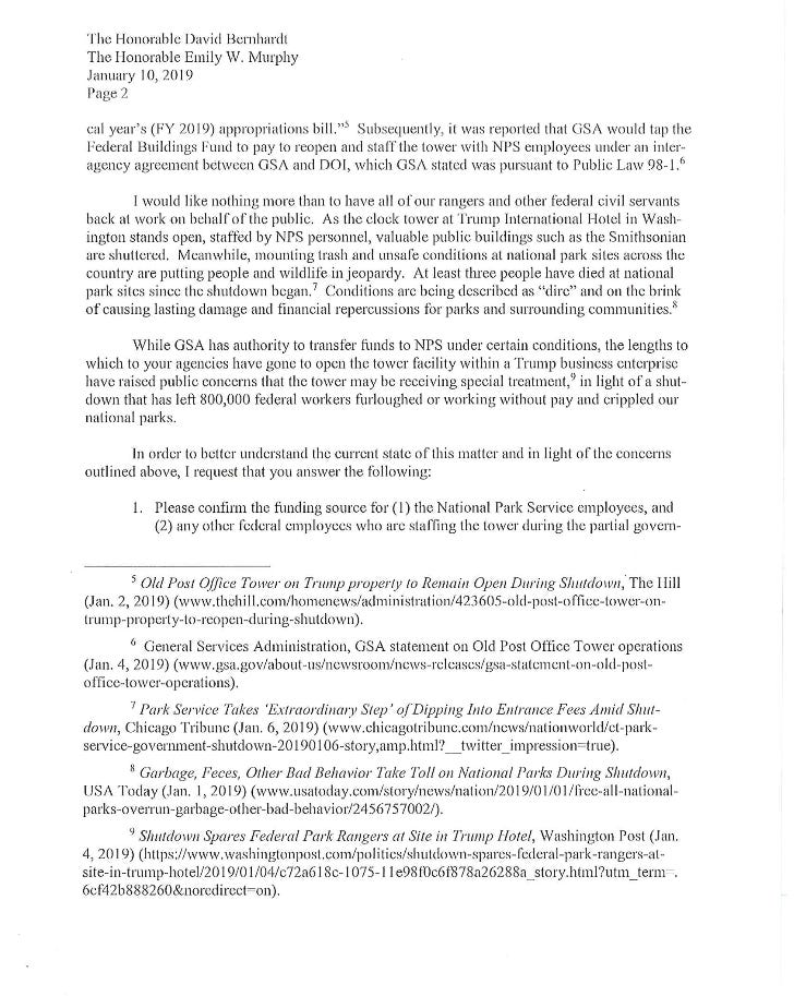 While GSA has authority to transfer funds to NPS under certain conditions, the lengths to which to your agencies have gone to open the tower facility within a Trump business enterprise have raised public concerns that the tower may be receiving special treatment, in light of a shutdown that has left 800,000 federal workers furloughed or working without pay and crippled our national parks.