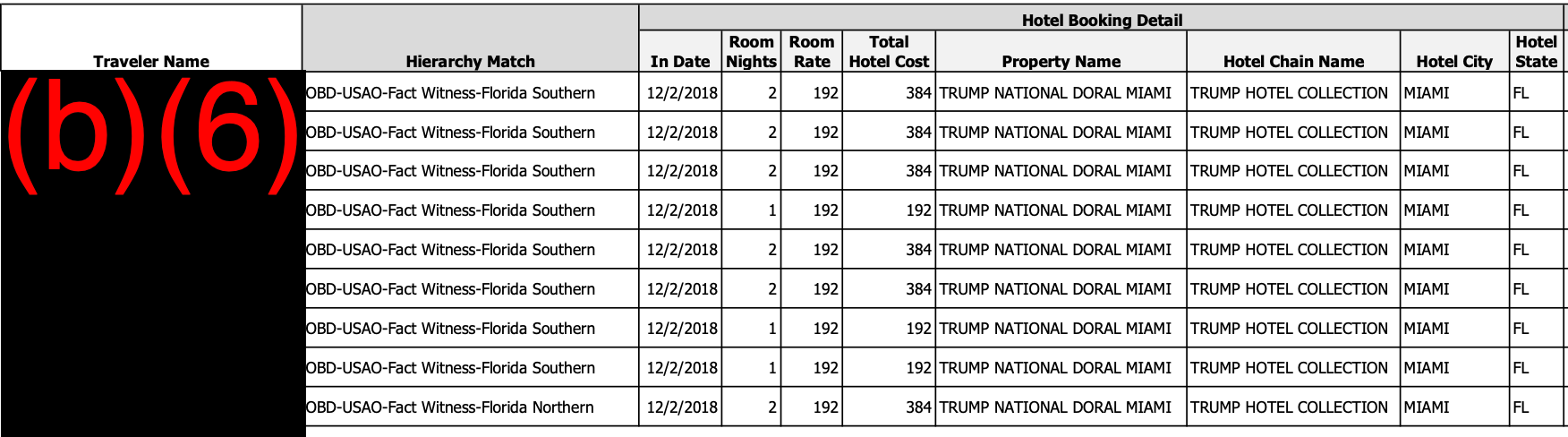 The Justice Department spent $2,880 on nine rooms for one- or two-night stays at Trump Doral on Dec. 2–4, 2018. Descriptions of the charges in documents the department provided to American Oversight in response to a Freedom of Information Act request implies the outlays were for accommodations for fact witnesses in cases involving the U.S. Attorney’s Office in the Southern District of Florida. A spokesperson for that office declined to provide details about the witnesses or cases, citing confidentiality concerns. The president’s Doral hotel is situated near several federal government offices.