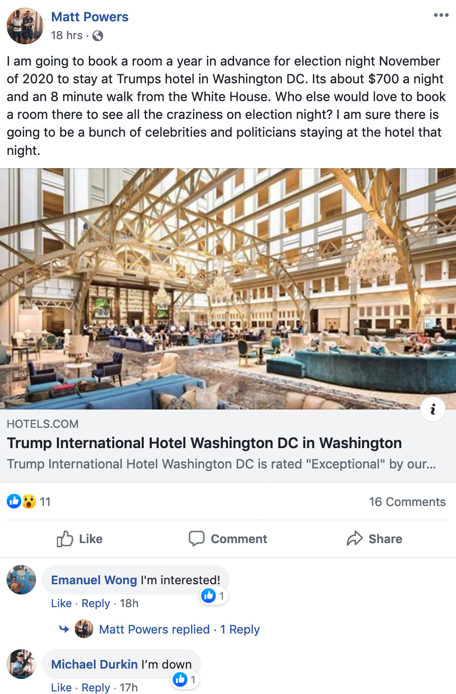 A Trump supporter is looking into booking the president’s hotel on election night 2020 to be near celebrities and politicians.