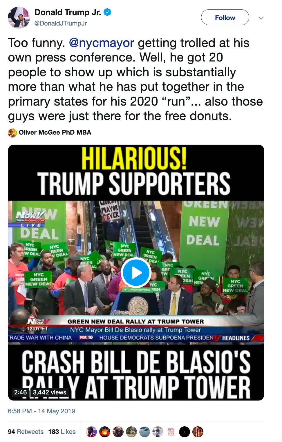 Donald Trump Jr. is a businessman (with properties in New York City) and walled off from his father’s administration. “Too funny.”