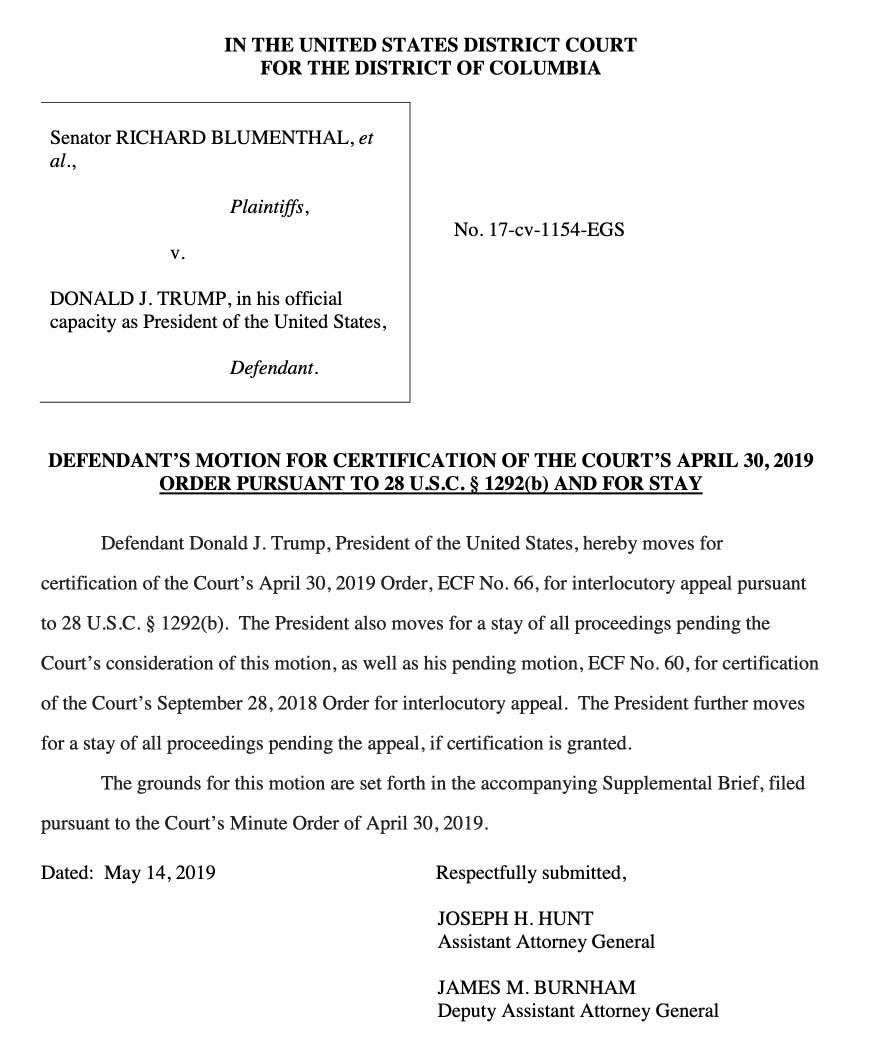 UPDATED Democratic senators and representatives’ emoluments lawsuit—On Sept. 28, Judge Emmet G. Sullivan ruled that the legislators have standing to sue. Trump’s Justice Department attorneys filed an interlocutory appeal on Oct. 22. On Jan. 30, 2019, the plaintiffs’ filed a notice of supplemental authority, notifying the court of the GSA inspector general’s report that criticized GSA for failing to consider if the Trump Hotel D.C.’s lease was in compliance with the Constitution after Trump became president. Two days later, the president’s attorneys argued that the IG’s conclusion was not inconsistent with Trump’s argument, but that the judge should ignore that report anyway because the IG has no expertise in interpreting or applying the foreign emoluments clause. On April 30, Sullivan denied Trump’s motion to dismiss the suit. While the president’s attorneys have a supplemental brief due on May 28, on May 14 they filed a motion to stay the proceedings while they appeal Sullivan’s decision.