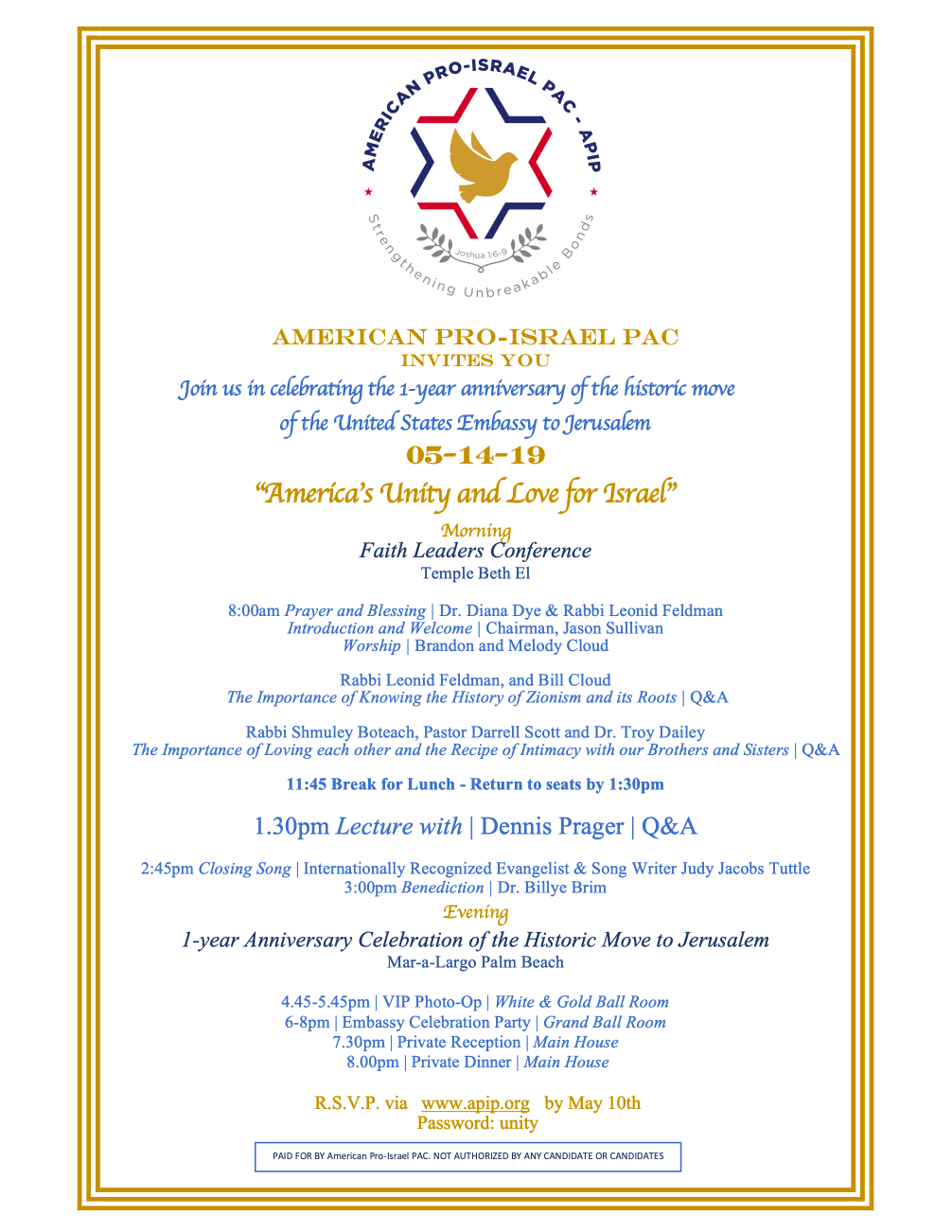 Last night the American Pro-Israel PAC partied at Mar-a-Lago to celebrate the one-year anniversary of the club’s owner relocating the U.S. embassy in Israel from Tel Aviv to Jerusalem.
