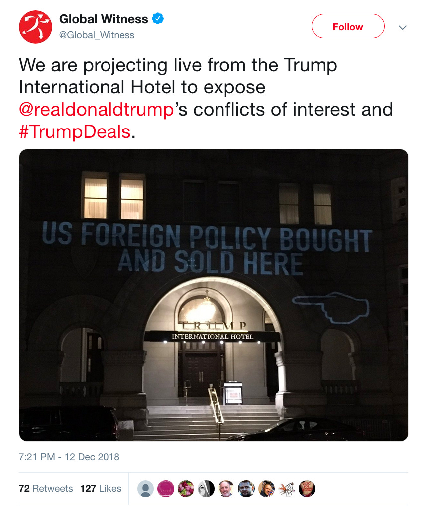 NGO Global Witness and Robin Bell projected a protest about the president’s conflicts of interest on the building.