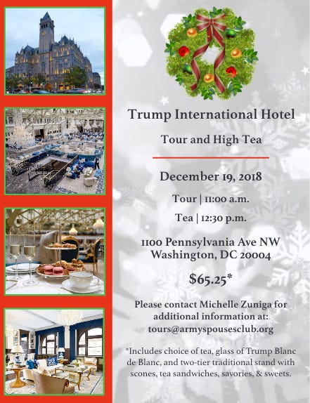 The Army Spouses Club will return to the commander-in-chief’s hotel with a $65.25 per person tour and high tea next Wednesday. The group held a similar event last April, with 38 registered attendees.