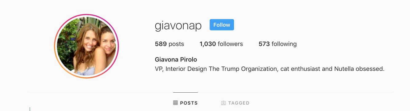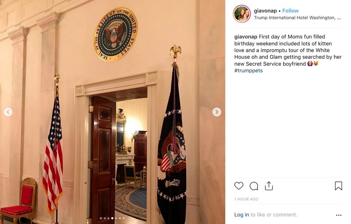 Sullivan’s Instagram account—now private—also contains a clue as to how they, along with at least six other loved ones, likely got this self-described unplanned, personal White House tour: she’s the vice president of interior design for the Trump Organization.