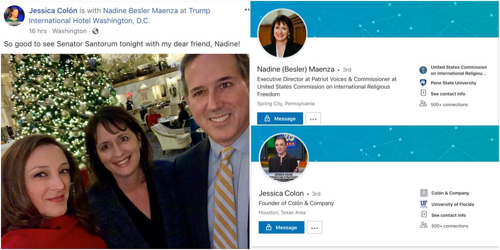Former Sen. Rick Santorum (R–PA) turned lobbyist and CNN pundit posed with political consultant Jessica Colón and executive director at the Santorum-founded Patriot Voices/commissioner at the United States Commission on International Religious Freedom, Nadine Maenza. (Maenza was appointed to the latter by the hotel’s owner.)