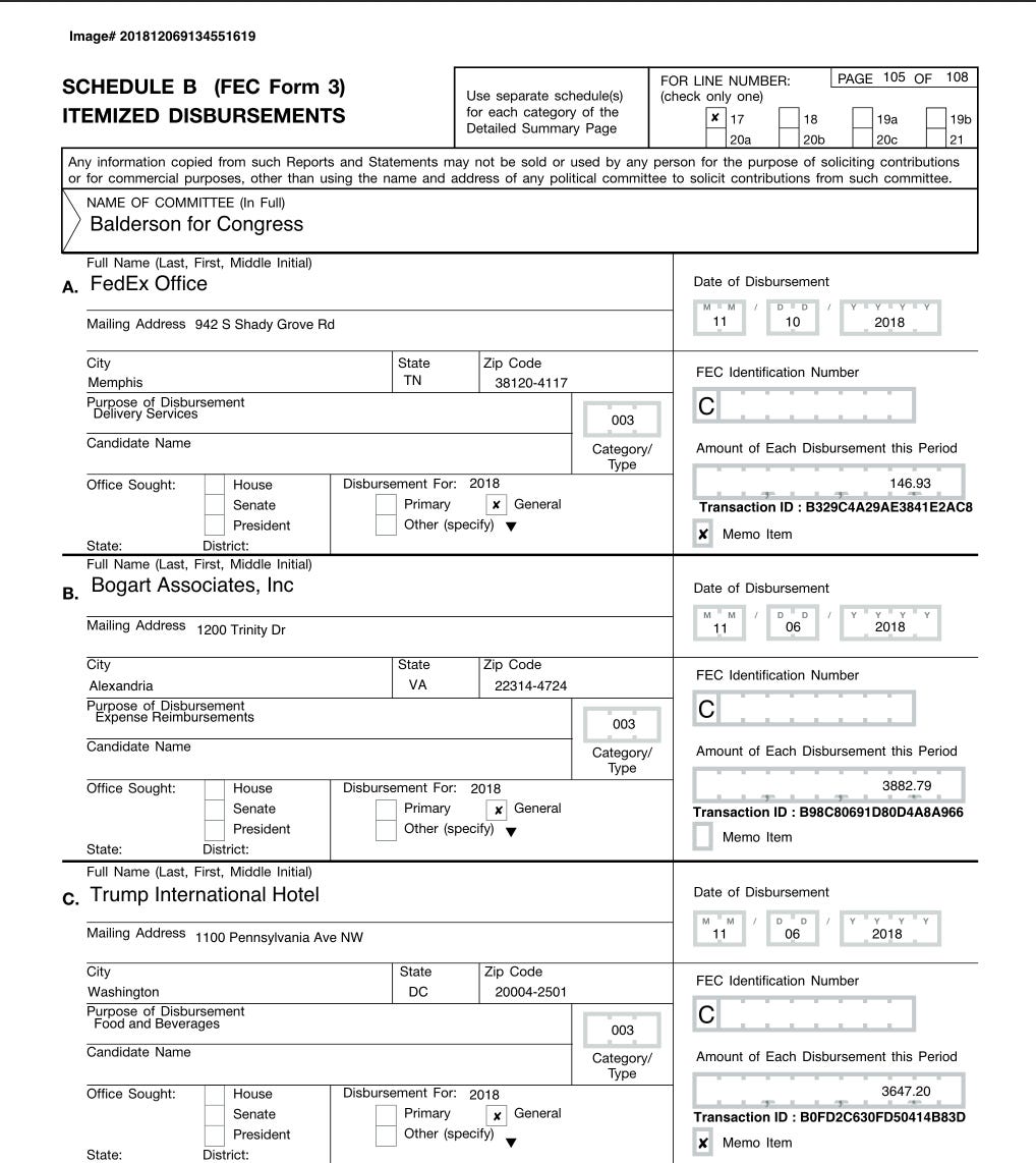 Rep. Troy Balderson’s (R–OH) campaign spent another $3,647.20 on food and beverage at the hotel on Nov. 18. In total his campaign has spent more than $9,000 at the president’s hotel.
