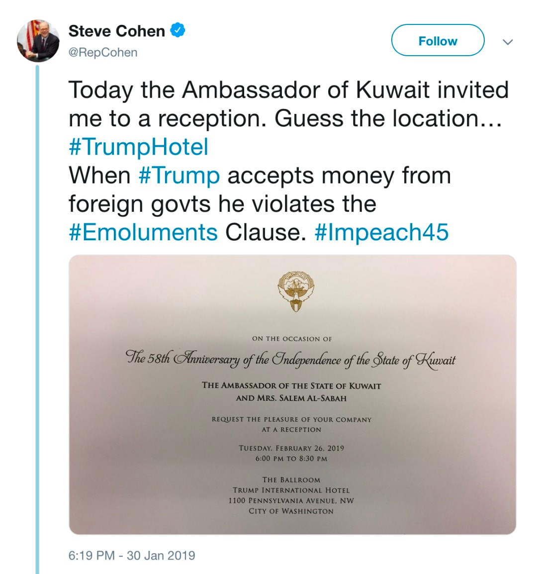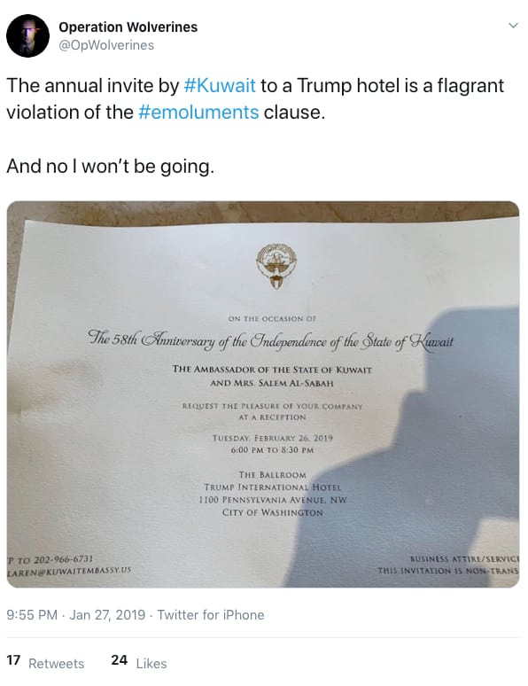 Kuwait invited a Congressman suing Trump for violating the foreign emoluments clause to its party at the Trump Hotel D.C.