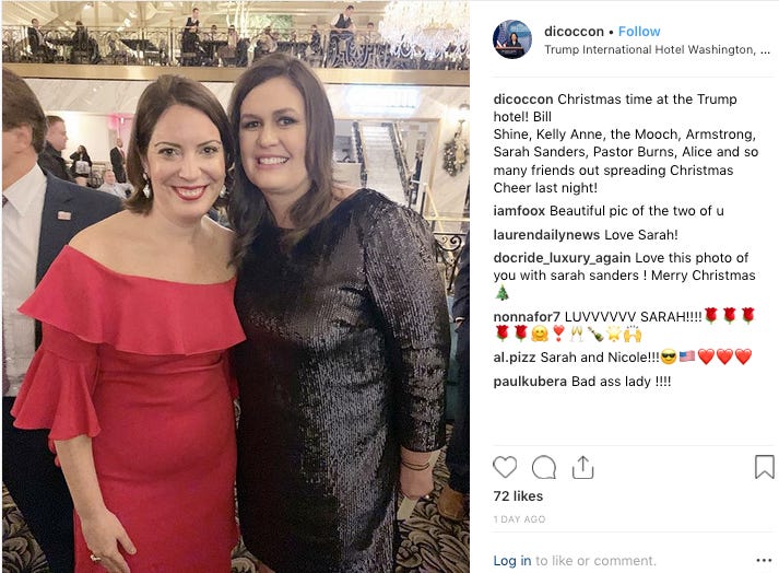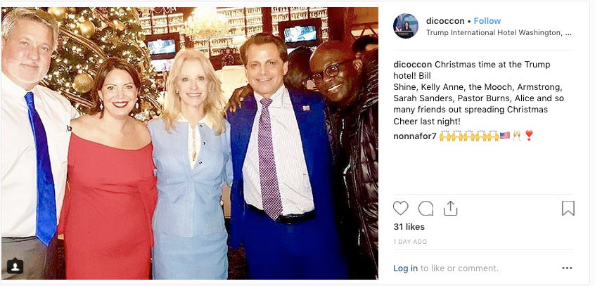 White House communications director Bill Shine, Trumpette Nicole Dicocco, White House counselor Kellyanne Conway, former communications director Anthony Scaramucci, and pundit Armstrong Williams spread Christmas cheer.