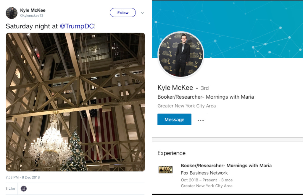 A booker and researcher with Fox Business News’s “Mornings with Maria,” Kyle McKee, was there Saturday night.