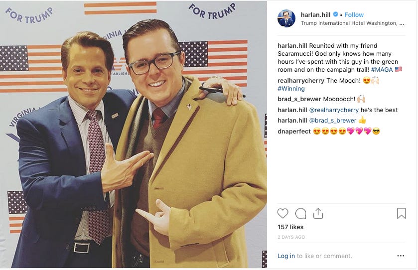 Finger guns were aimed all over the place when Scaramucci and Fox News pundit/Trump campaign advisor Harlan Hill were reunited.