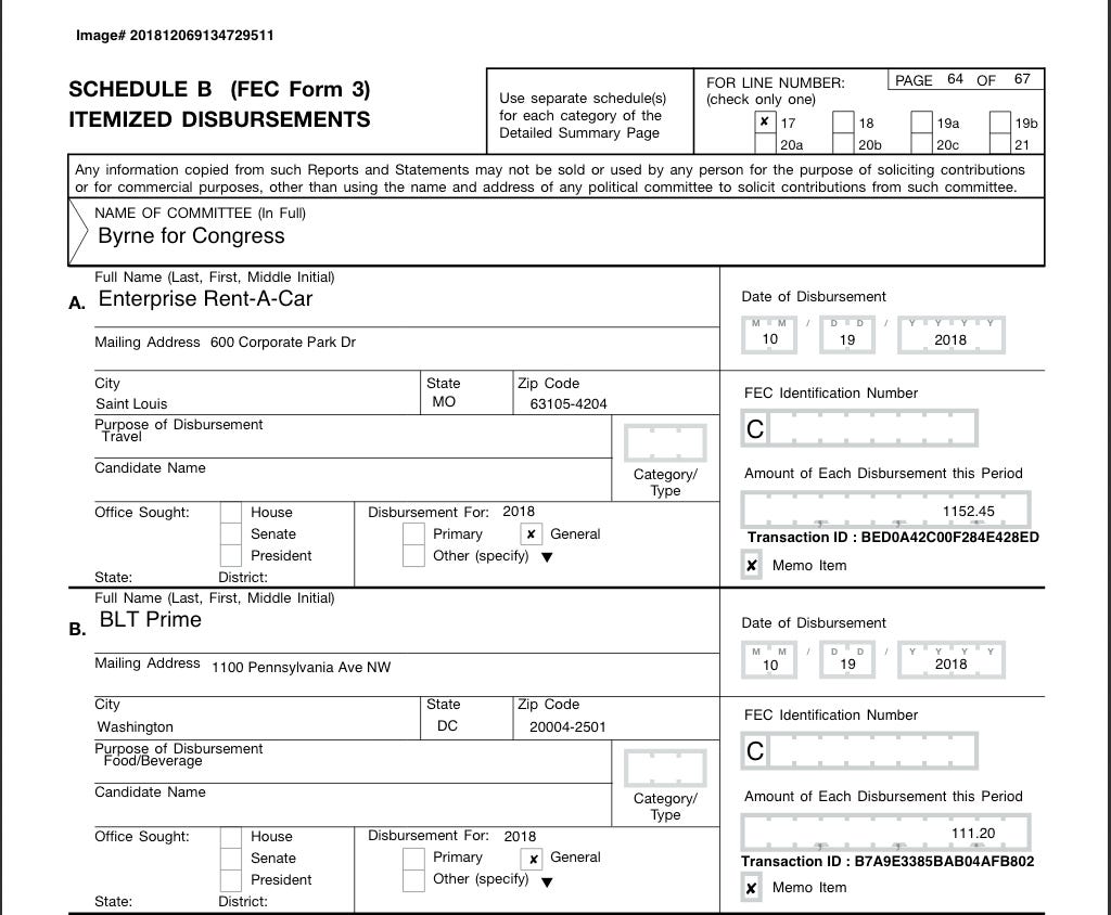 Rep. Bradley Byrne’s (R–AL) campaign spent $111.20 on food and beverage at the hotel on Oct. 19, 2018.