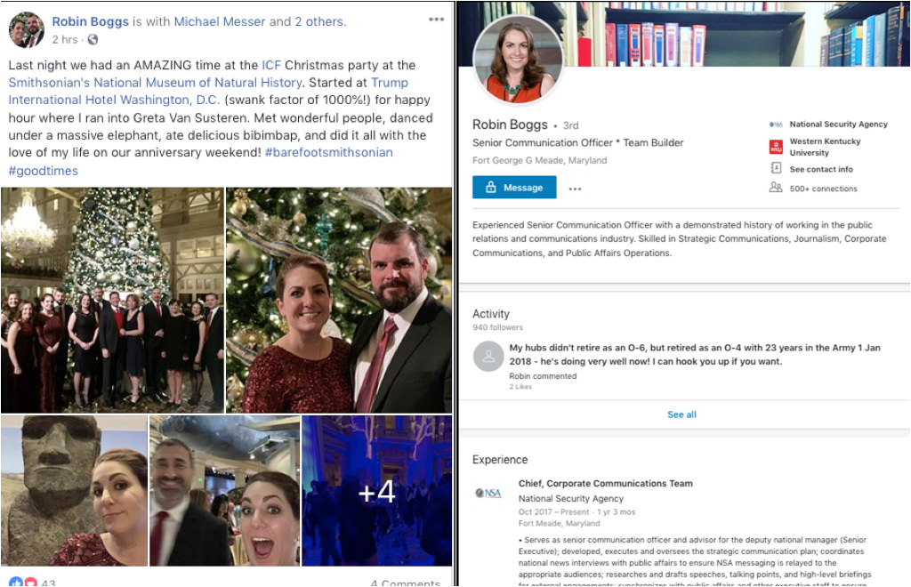 National Security Agency corporate communications team chief Robin Boggs enjoyed happy hour at the hotel, where she reportedly ran into Voice of America’s Gretta Van Sustren.