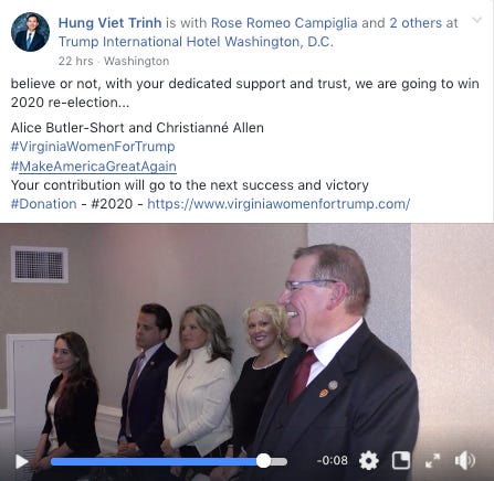 Friday night was a busy one at the Trump Hotel D.C. with top Trump administration officials hanging out there after a White House dinner while Virginia Women for Trump hosted a private reception and book signing with Anthony Scaramucci (tickets were $69–$250).