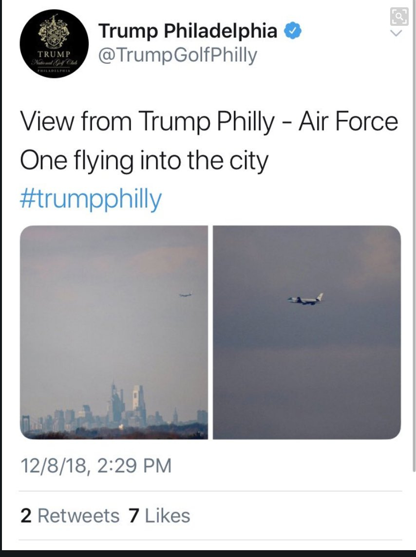 Trump National Golf Course Philadelphia promoted itself with a tweet, later deleted, showing Air Force One arriving in Philly for the Army–Navy game.