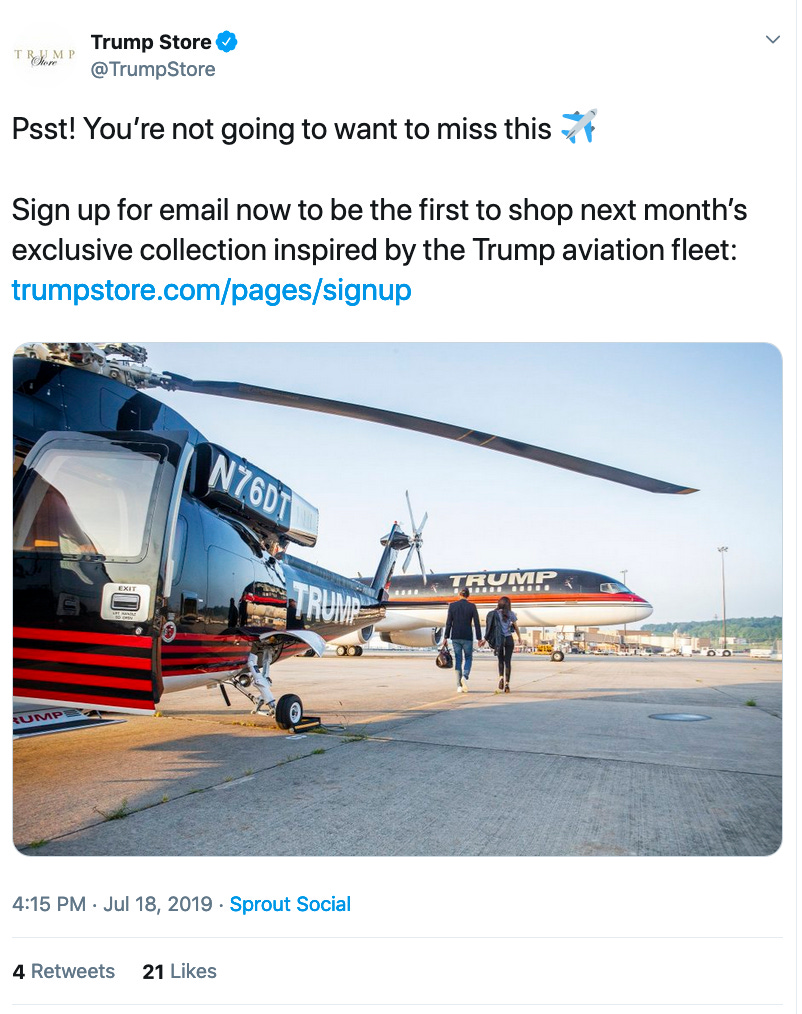 A month after President Trump announced plans to redesign Air Force One, making it look like his personal jet, the Trump Store announced a new collection of merchandise inspired by Trump’s personal jet.