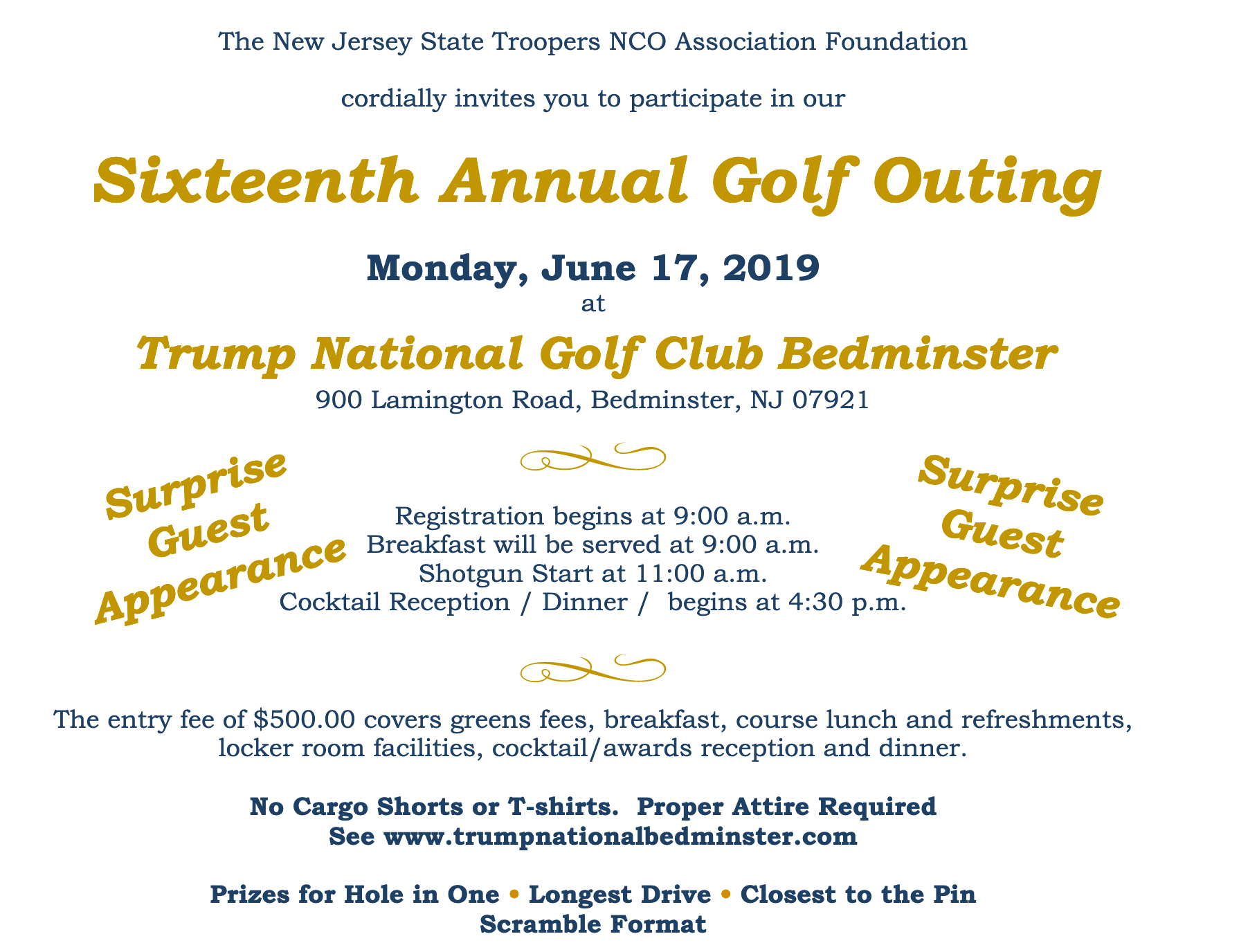 The New Jersey State Troopers Non Commissioned Officers Association Foundation held its annual golf outing at Trump Bedminster—$500 entry fee—on June 17. Sorry, “no cargo shorts.”