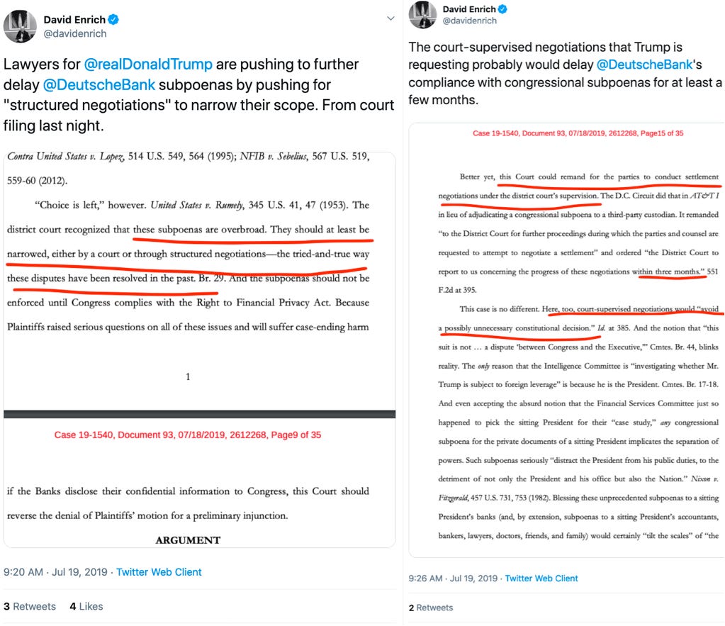 On March 11, the committee requested documents on Trump’s businesses from Capital One; the bank “said it was already preserving documents but needs a subpoena in order to comply” per Politico. On April 15, that subpoena was issued. All told, the committee reportedly has subpoenaed nine banks for information about President Trump’s finances. President Trump, Don. Jr., Eric, Ivanka, and their businesses sued Deutsche Bank and Capital One on April 30, however, to prevent them from sharing financial records with Congress. Schiff said Deutsche Bank has been willing to cooperate with lawmakers. On May 3, the Trumps filed for a preliminary injunction to block the subpoenas. But U.S. District Court Judge Edgardo Ramos (an Obama appointee) declined to issue that injunction on May 22, saying that the financial institutions can comply with the lawmakers’ request. The Trumps’ appealed that ruling on May 24. The lawmakers and Trumps agreed to refrain from enforcing the subpoenas until after the appellate court rules. The court announced it will expedite the briefing process to end on July 18. Oral arguments are scheduled for Aug. 23. On July 18, Trump’s attorneys filed a motion to narrow the scope of the subpoenas. The process they proposed also would delay Deutsche Bank’s compliance, according to David Enrich of The New York Times.