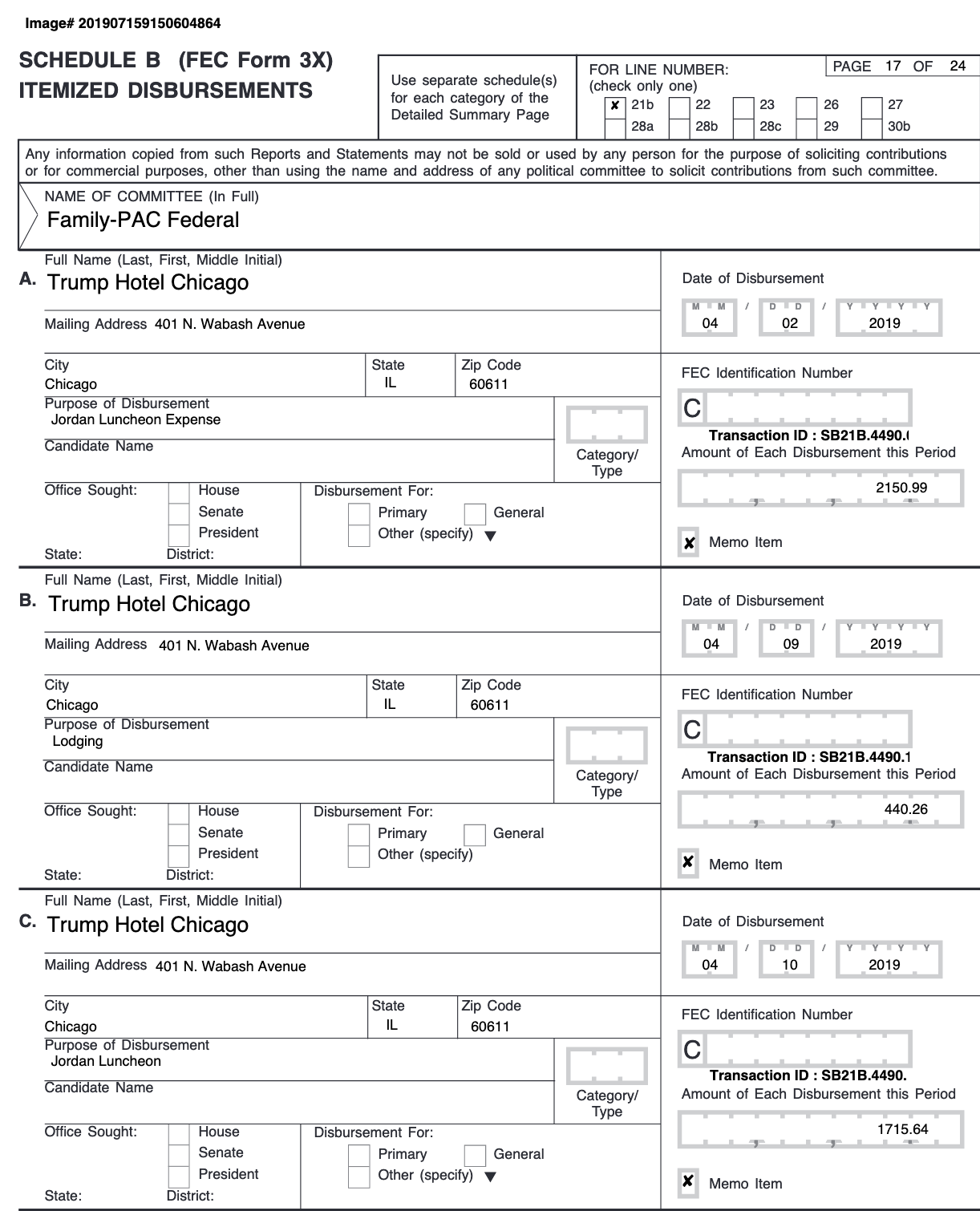 The conservative Family-PAC Federal spent $4,306.89 at the Republican president’s Chicago hotel in April. Most of that amount went to pay for a fundraising luncheon featuring Rep. Jim Jordan (R–OH), the ranking member of the House Oversight committee and one of the Trump Org’s biggest champions in Congress. Family–PAC Federal has reported spending a total of $11,331.31 at the Trump Hotel Chicago.