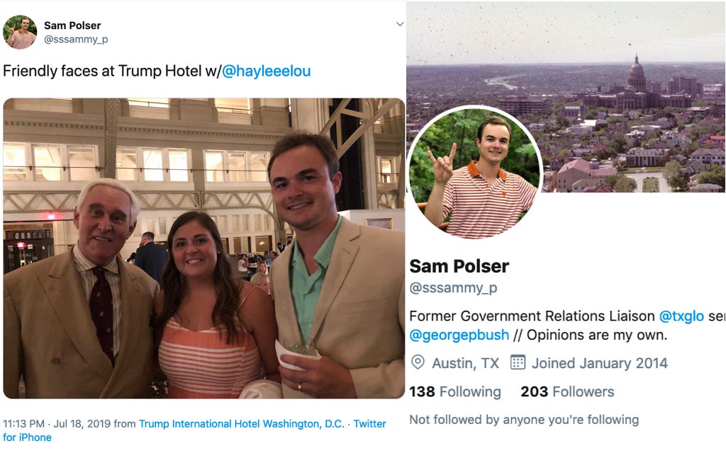 A freshly gagged Roger Stone posed with a former government relations liaison at Texas’s General Land Office, Sam Polser.